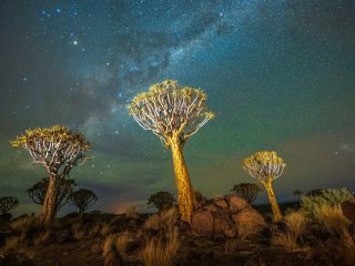 Quiver trees at night with the Milky Way, Keetmanshoop, Namibia