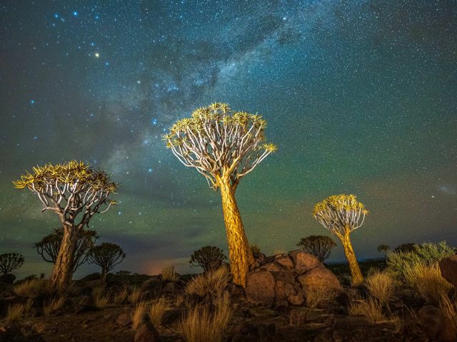 Árboles Quiver por la noche con la Vía Láctea, Keetmanshoop, Namibia