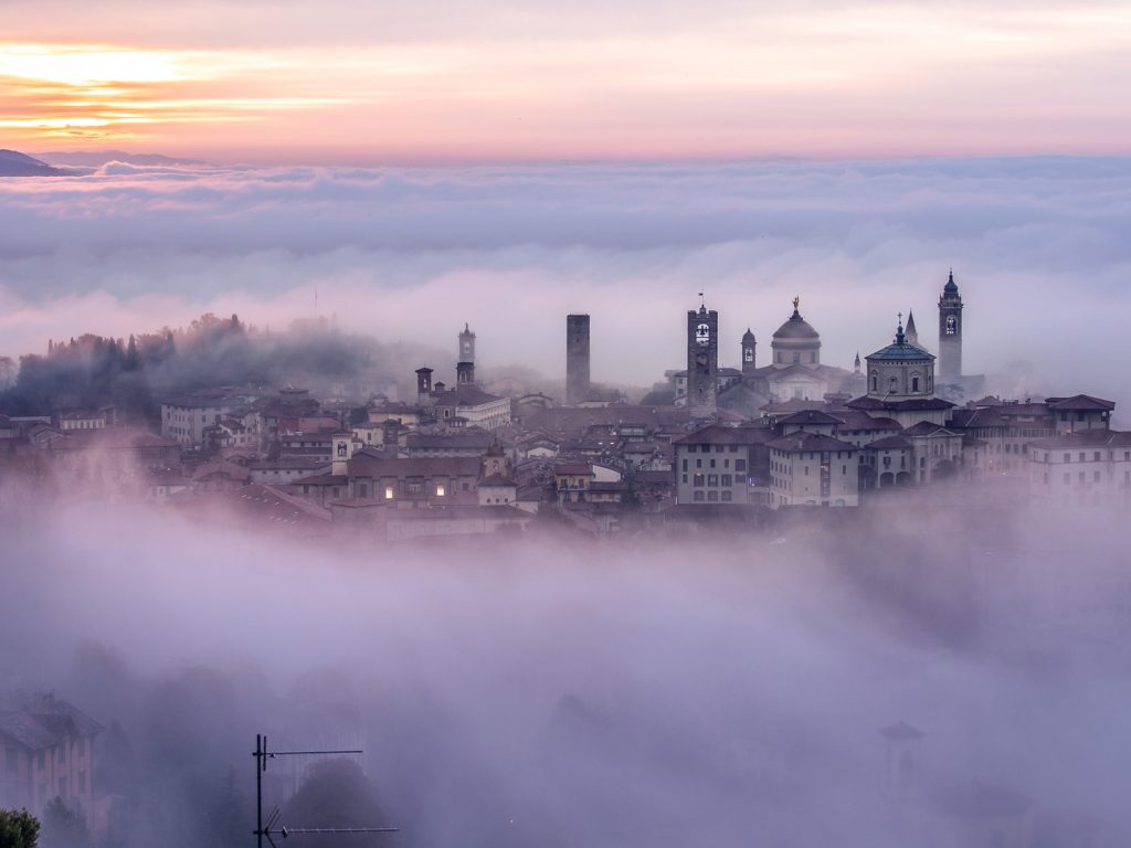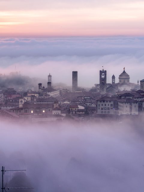 Città Alta di Bergamo avvolta dalla nebbia, Lombardia