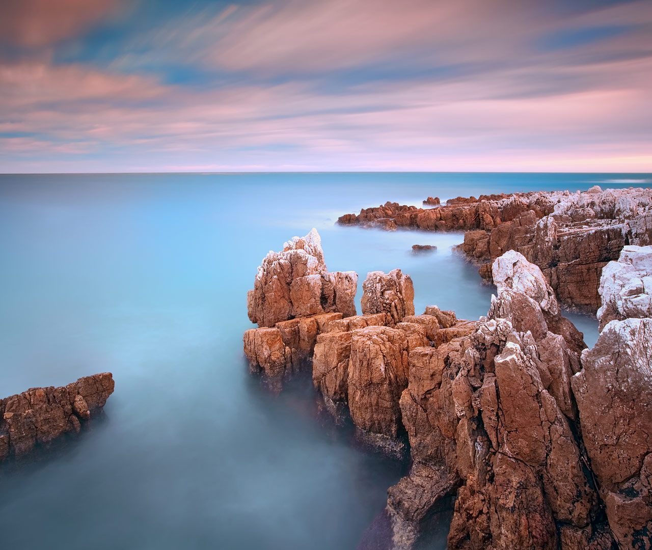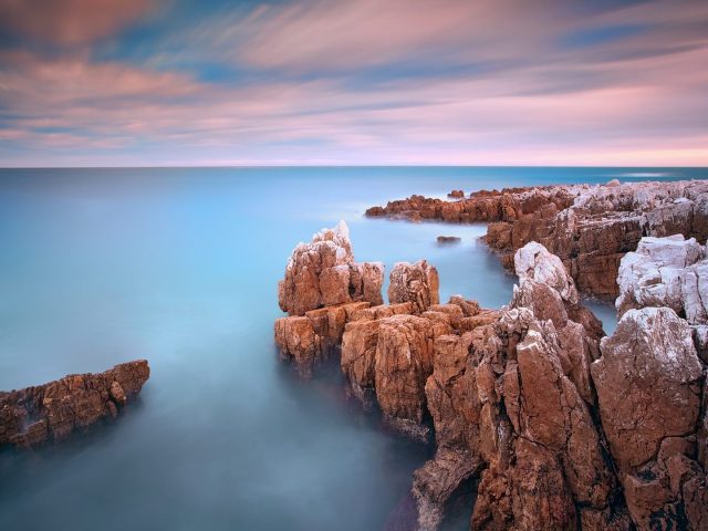Rochers dans la mer au coucher du soleil, au Cap d’Antibes, Provence-Alpes-Côte d’Azur