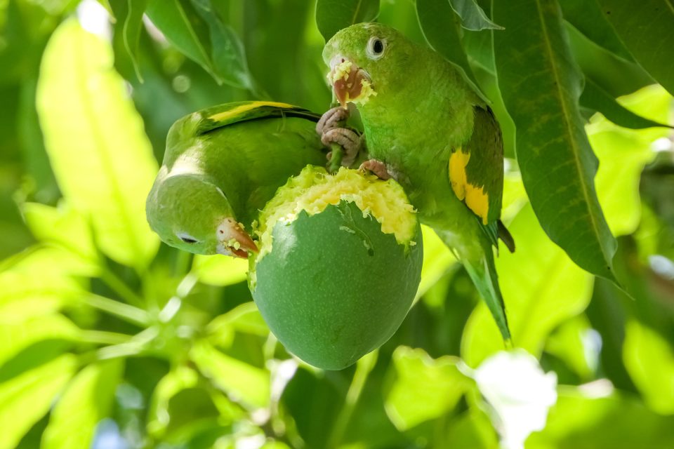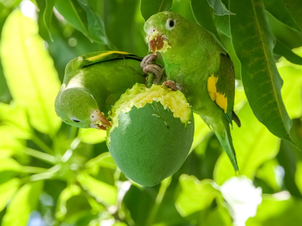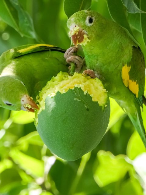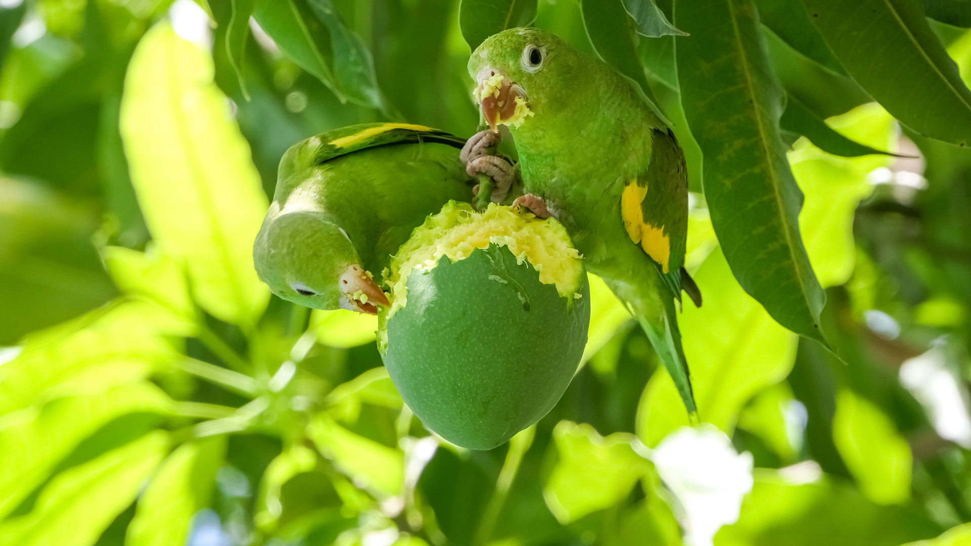 Periquito-de-encontro-amarelo em uma árvore de manga no Pantanal