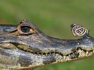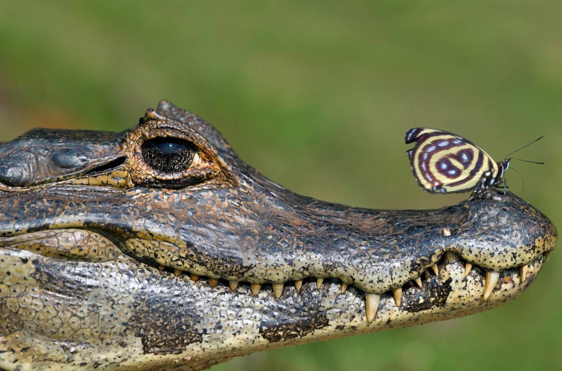 Jacaré-do-pantanal com uma borboleta pousada em seu focinho, Pantanal