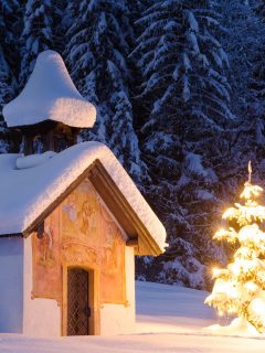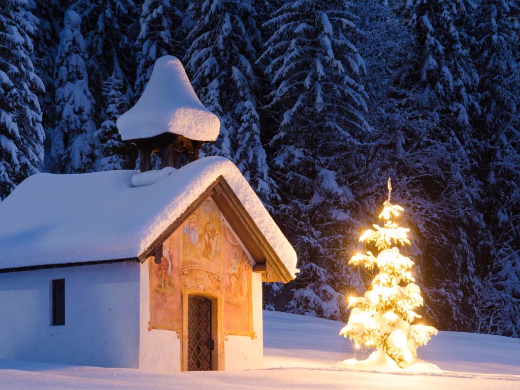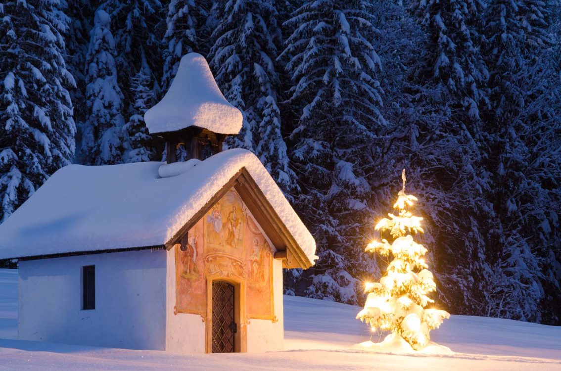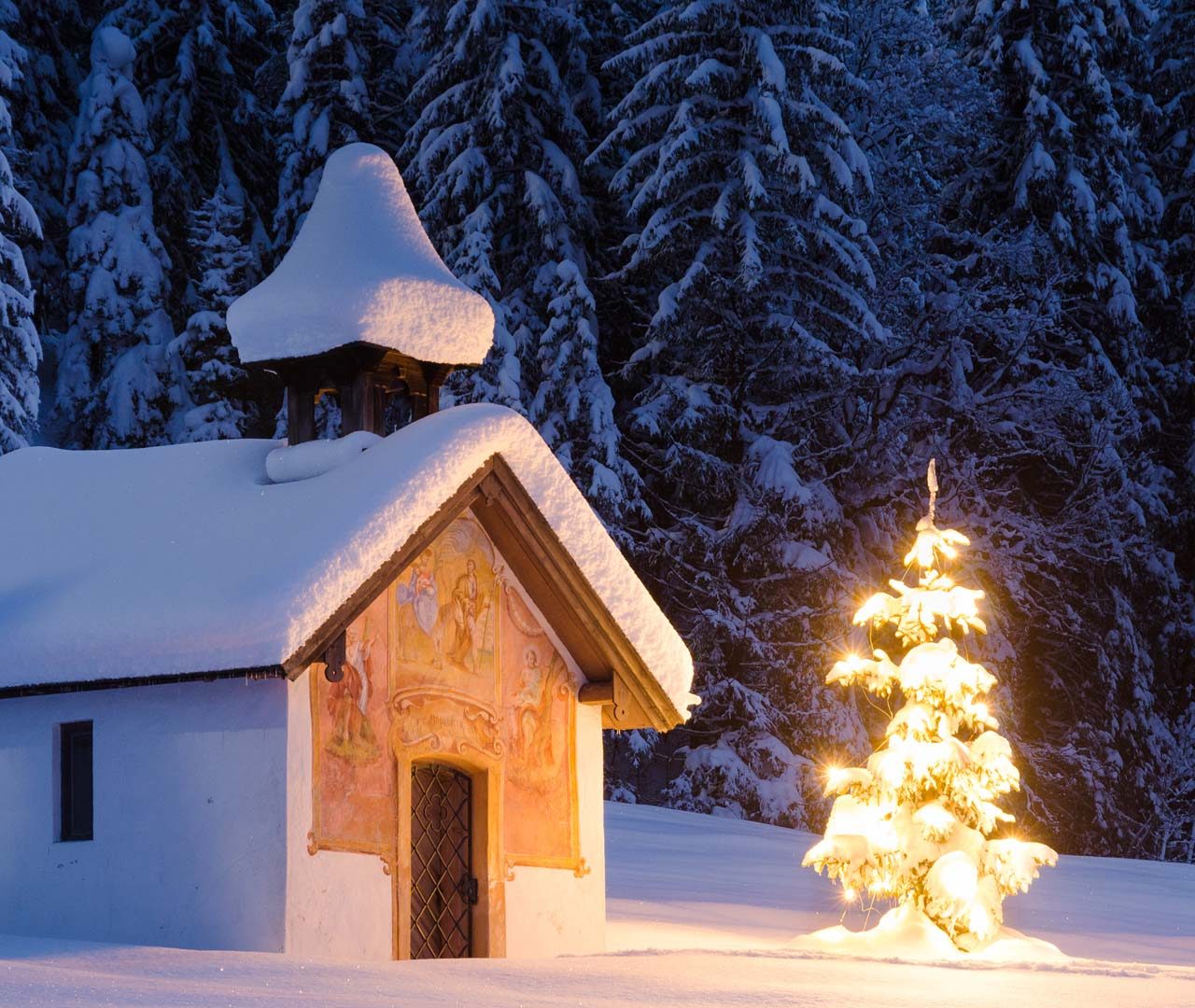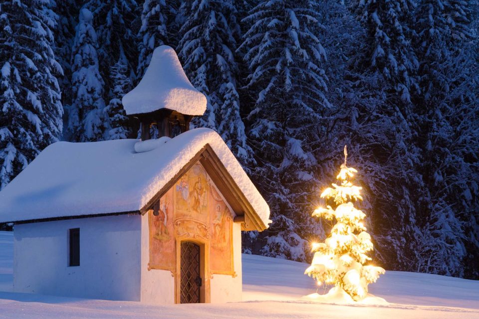 Kapelle und Weihnachtsbaum in winterlicher Landschaft, Elmau, Bayern