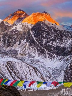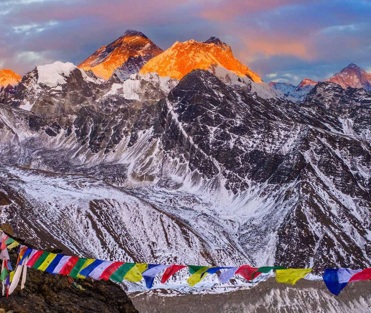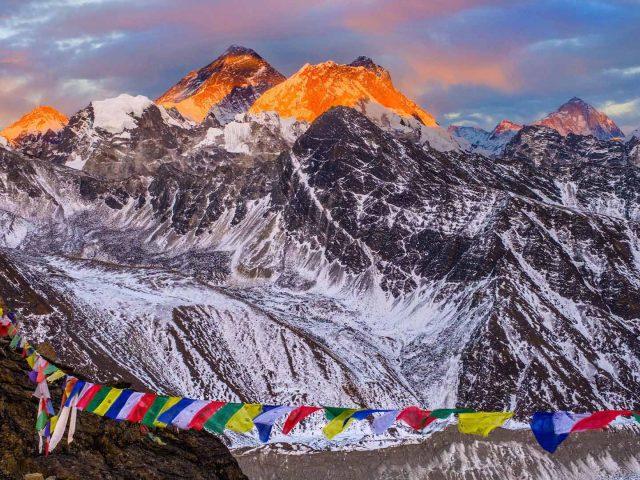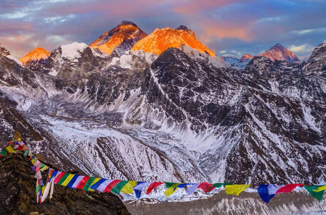 The summit of Mount Everest at sunset, seen from Renjo La, Nepal