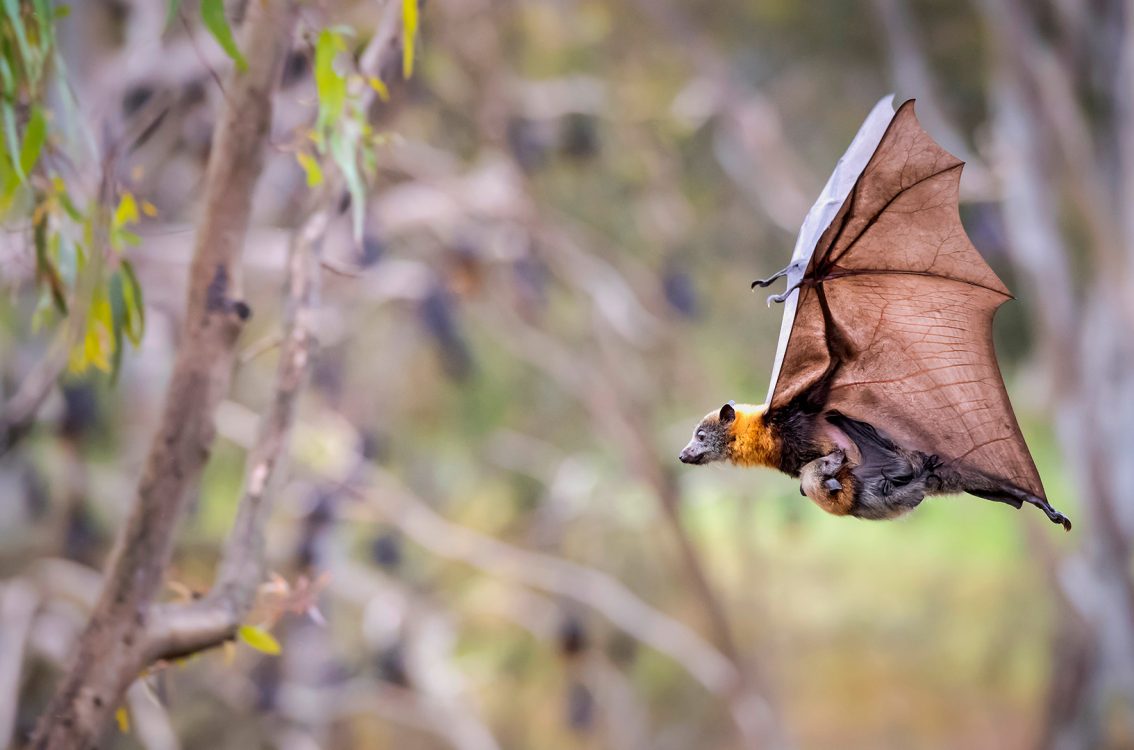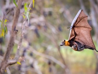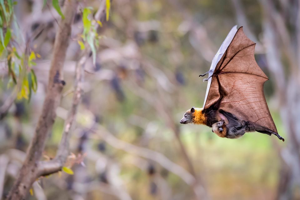 Grey-headed flying fox carrying her pup, Yarra Bend Park, Australia