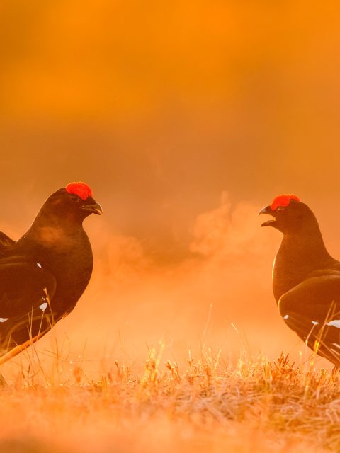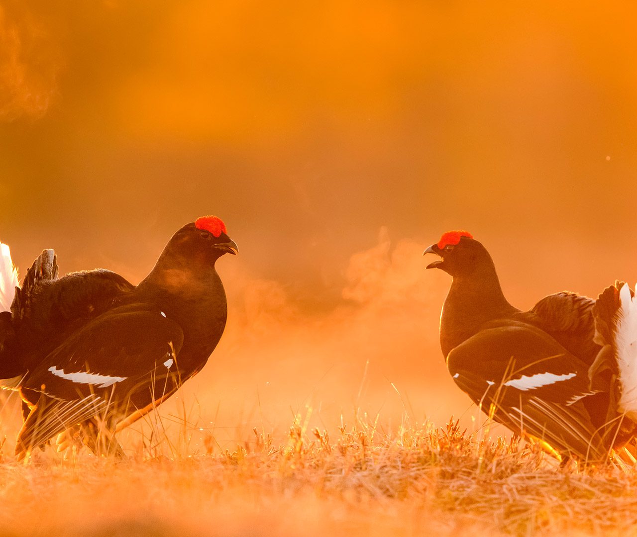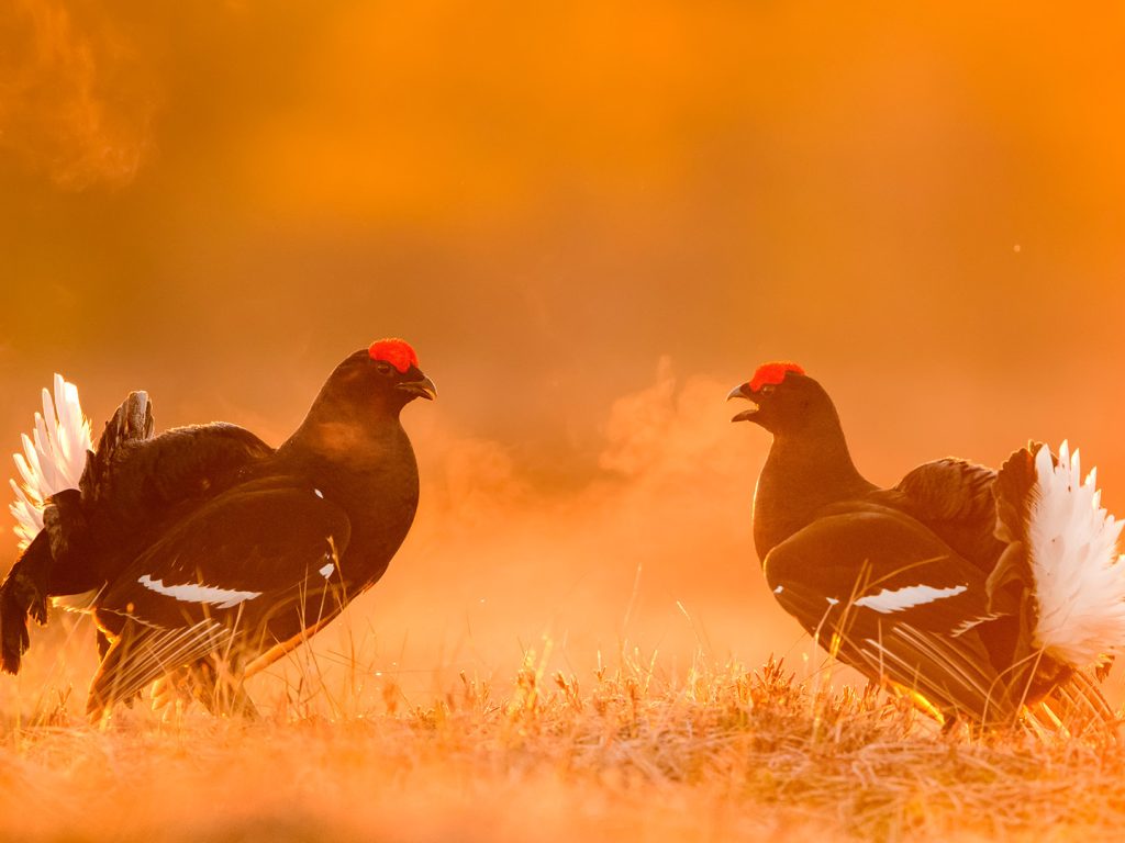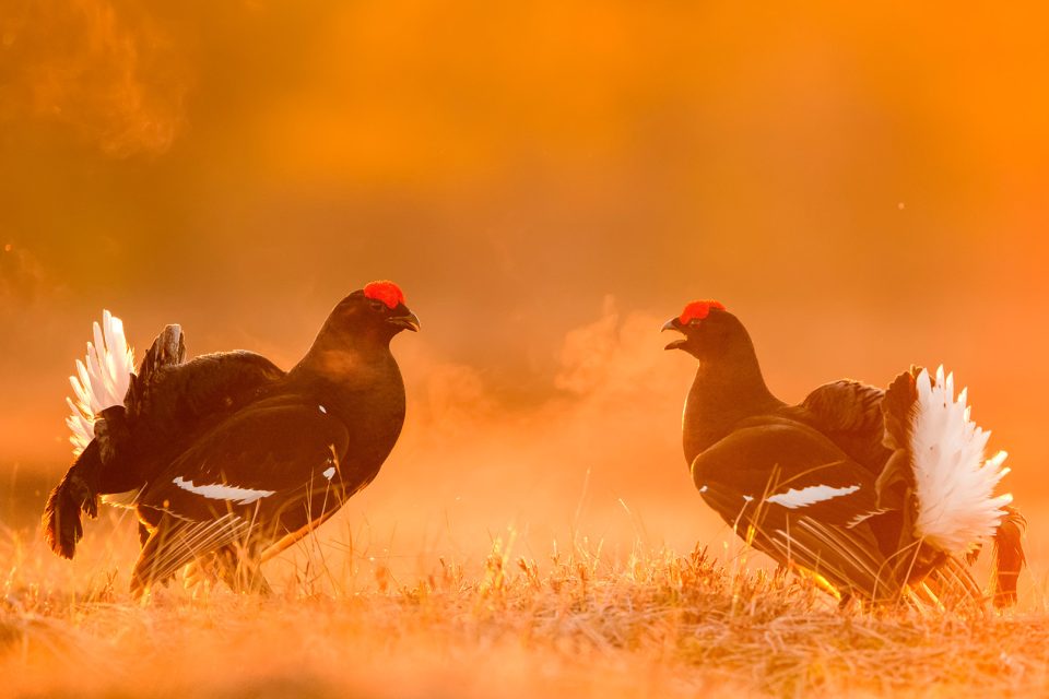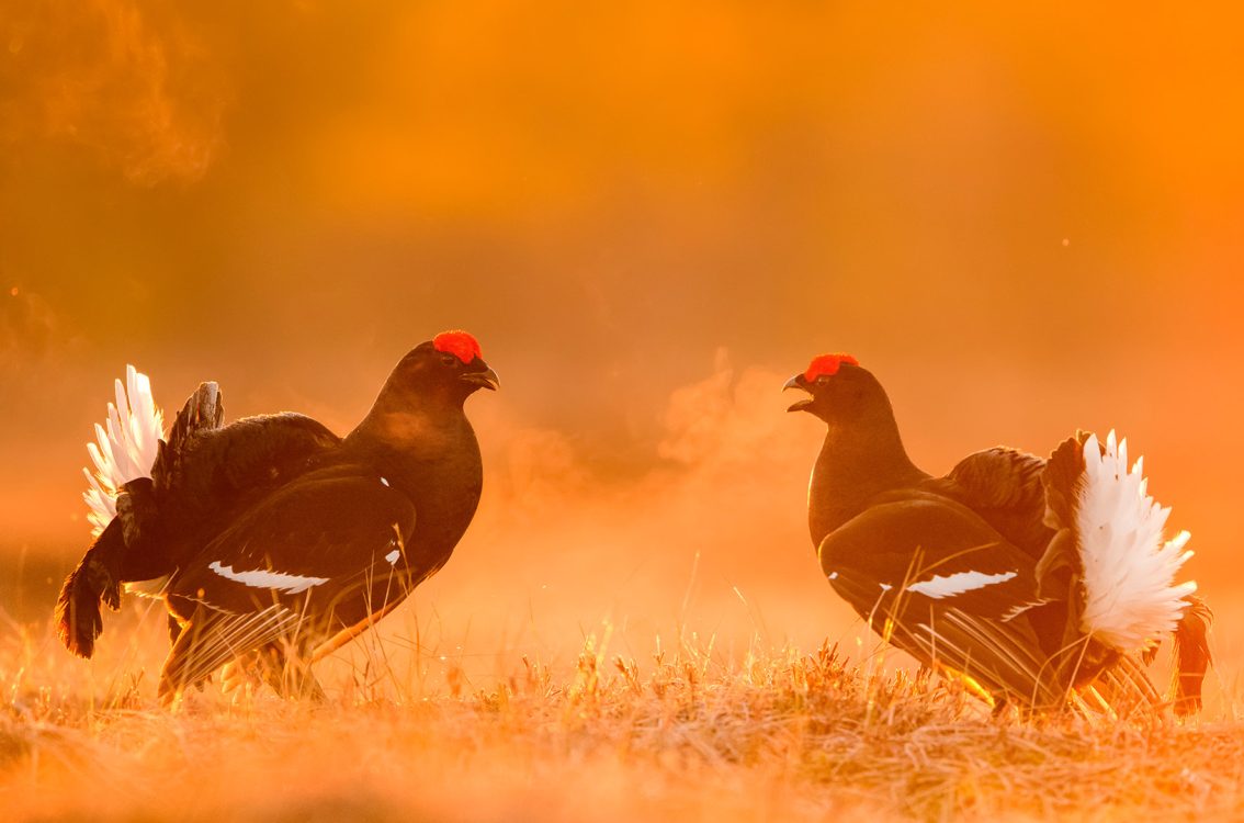 求偶展示场上对峙的雄性黑琴鸡,爱沙尼亚