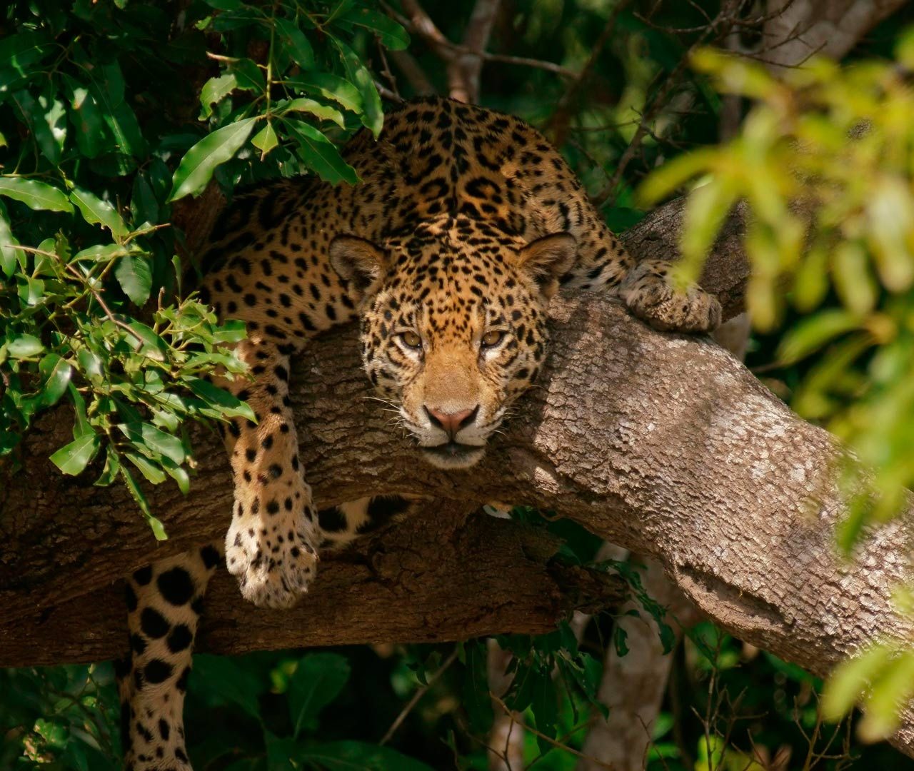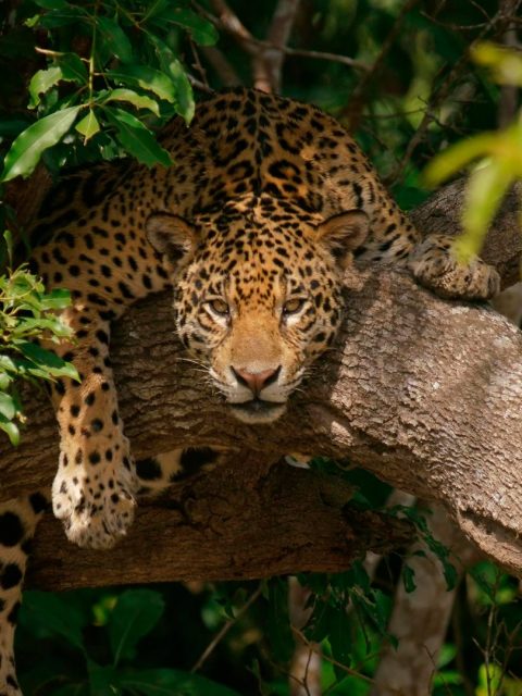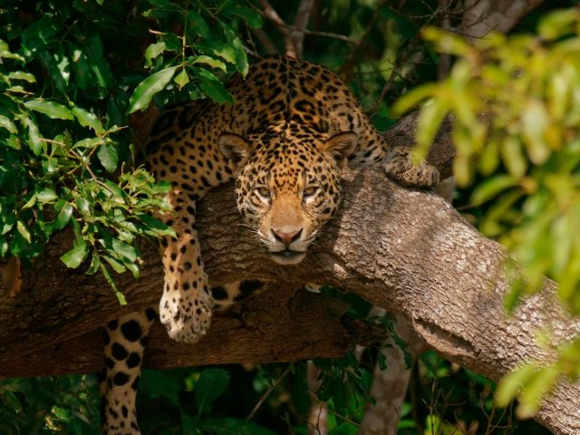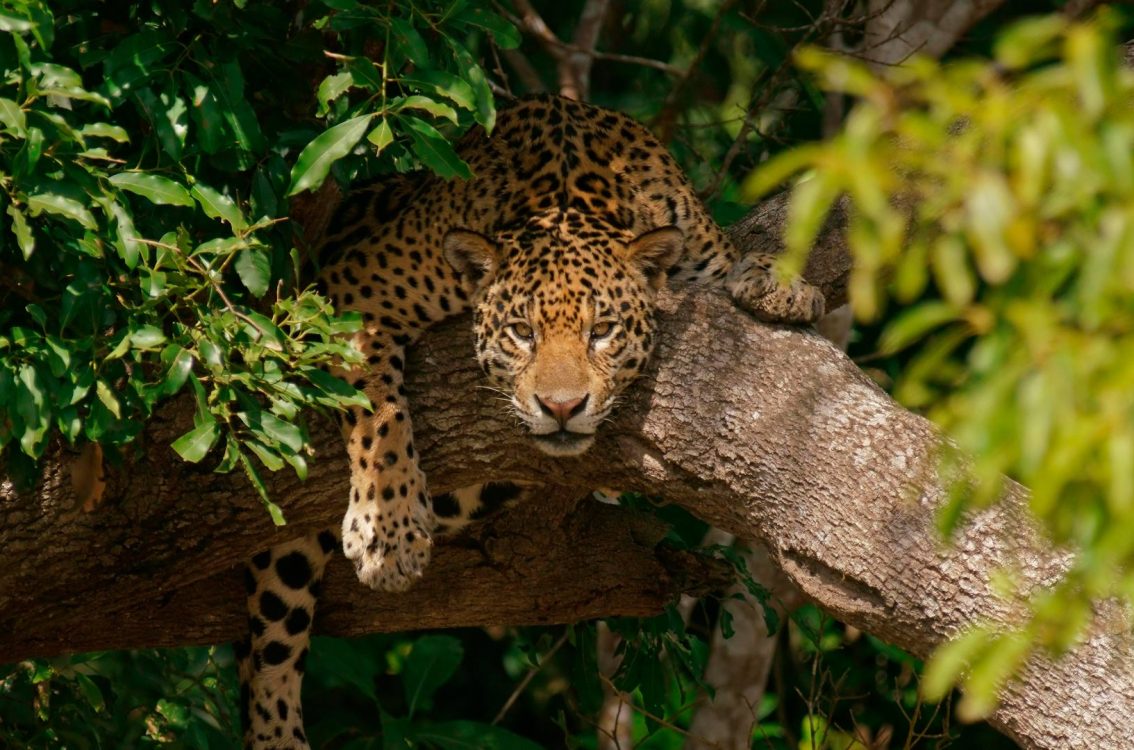 Onça-pintada observando de uma árvore, Pantanal, Mato Grosso
