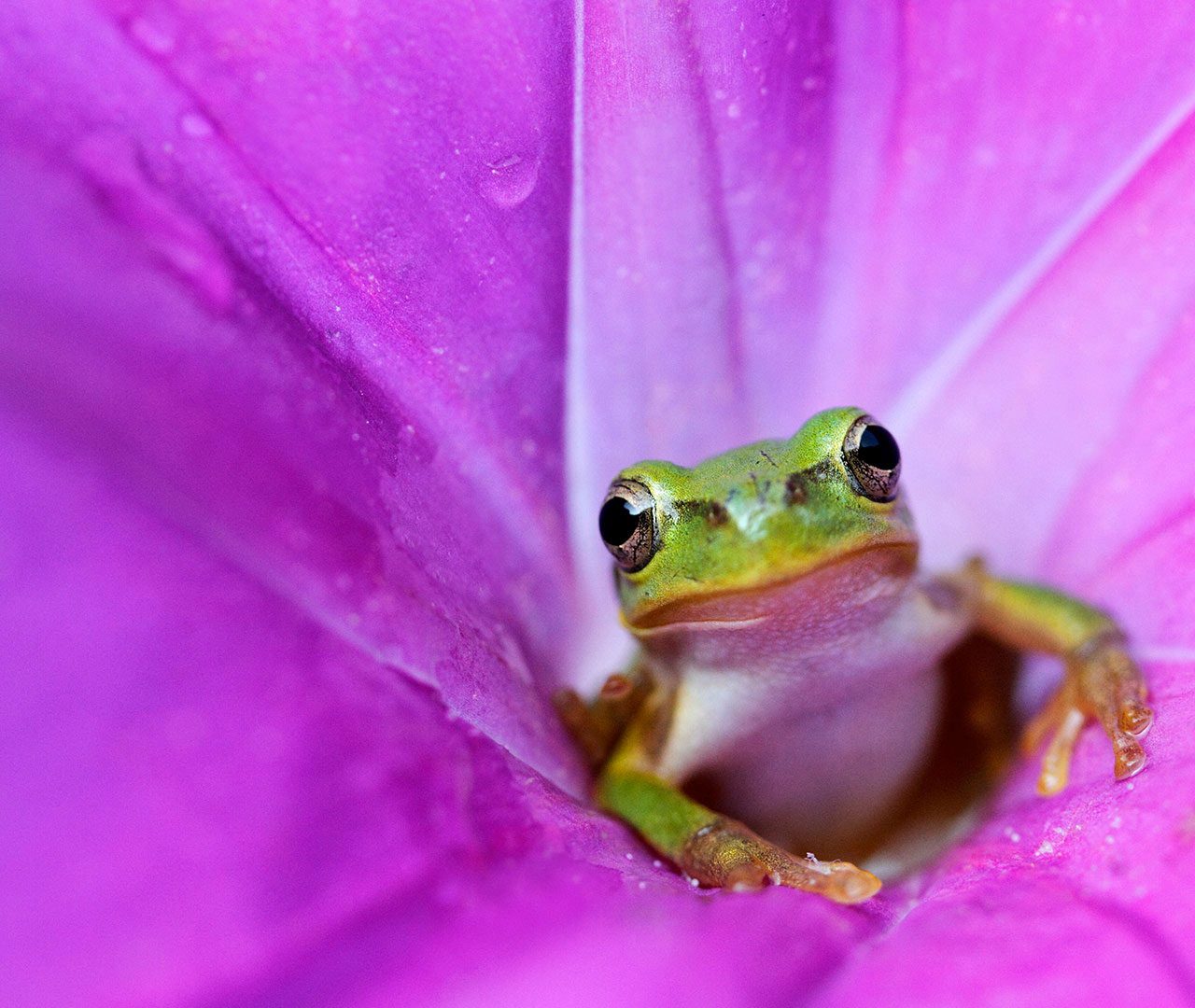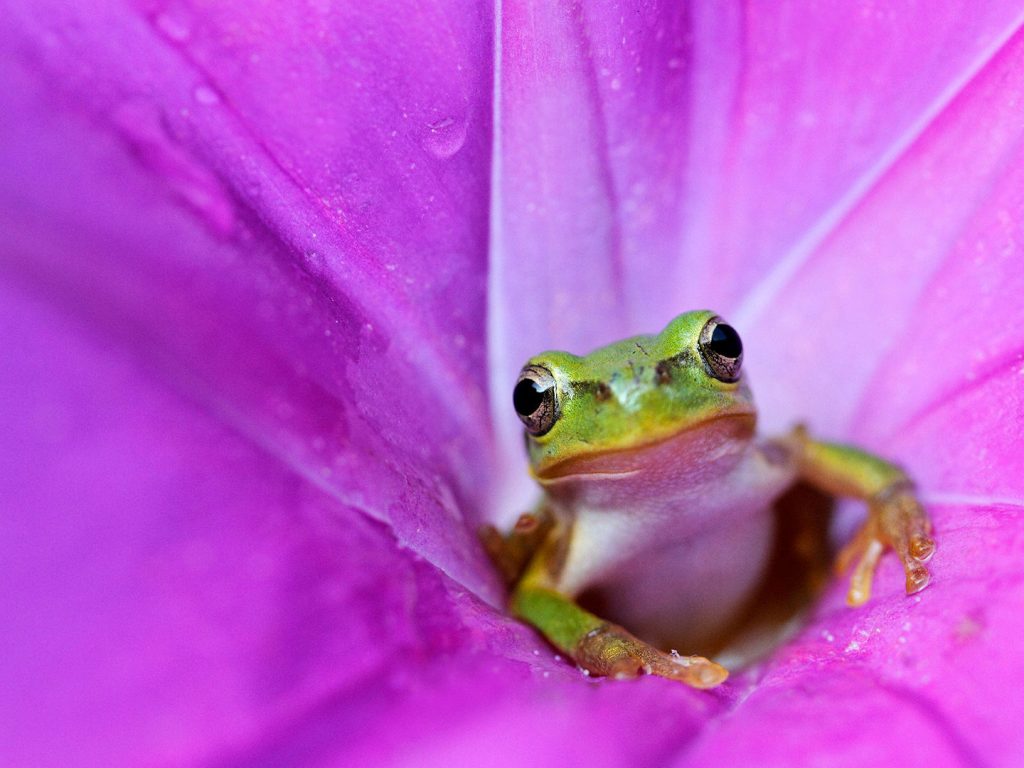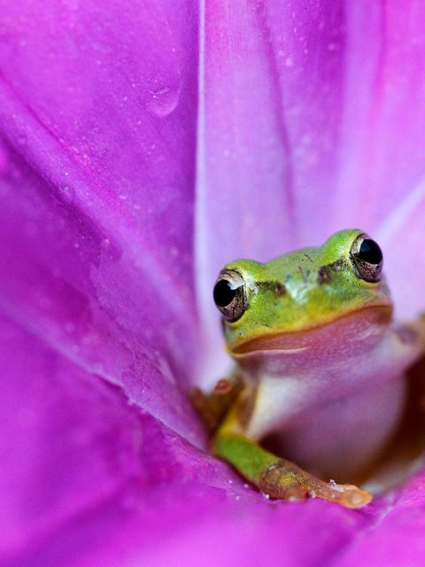 Rainette japonaise au cœur d’une fleur de liseron rose