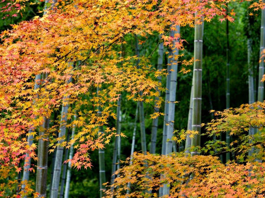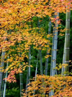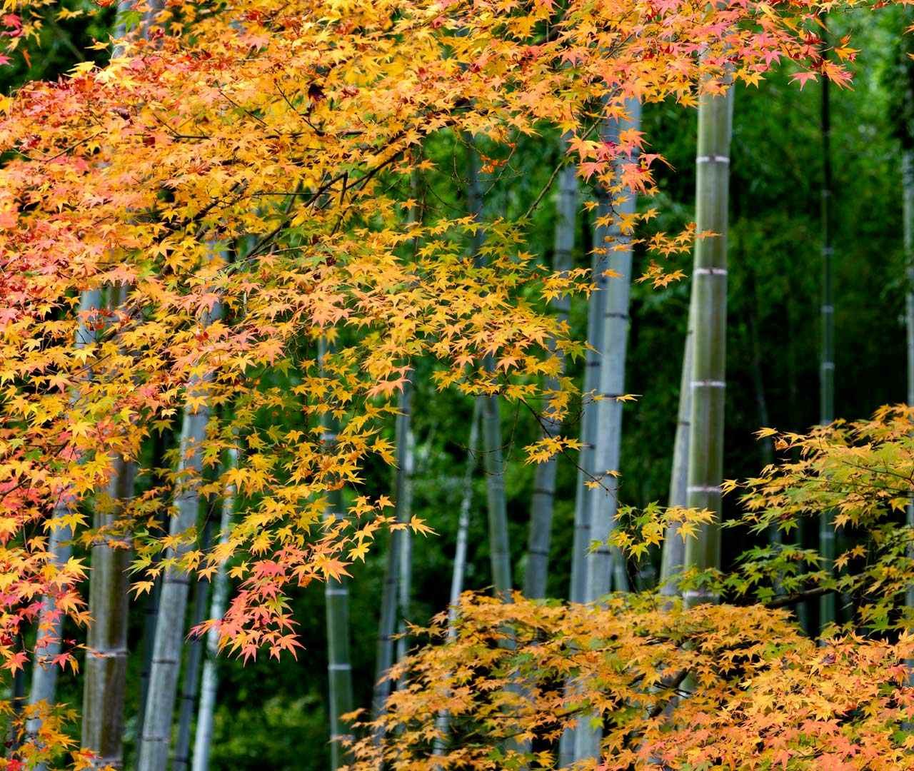 Colourful maple leaves and bamboo forest in Arashiyama, Kyoto, Japan