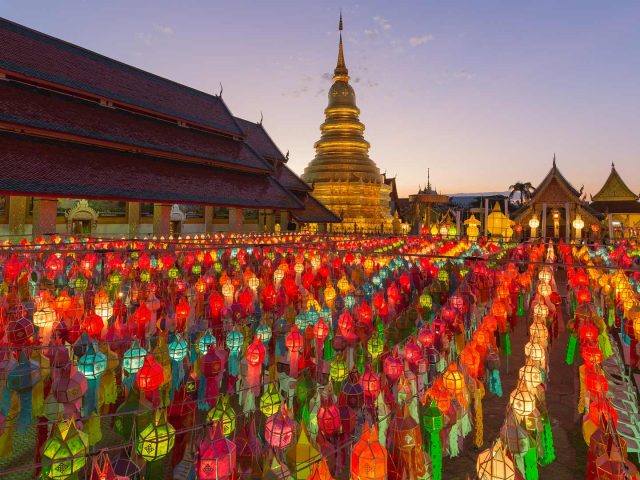 Colourful lanterns at the temple of Wat Phra That Hariphunchai, Lamphun, Thailand