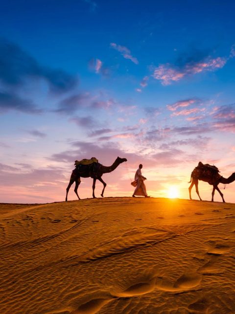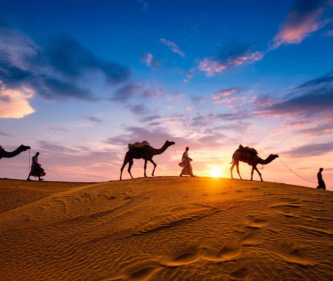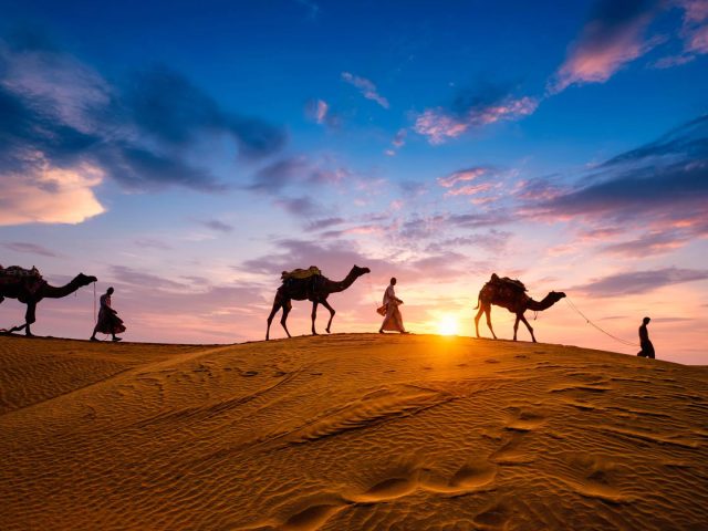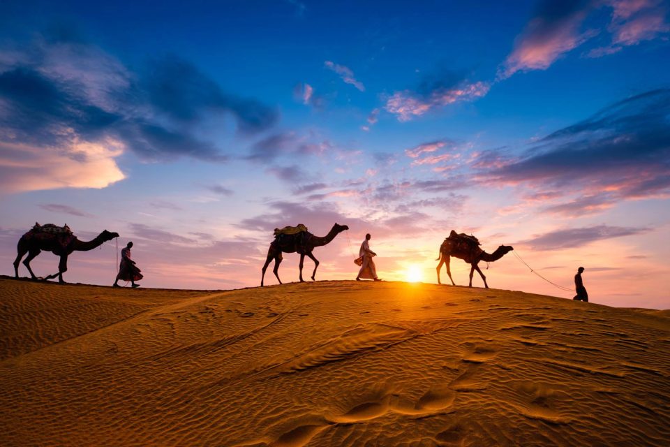 砂漠を歩くラクダたち, インド ラージャスターン州