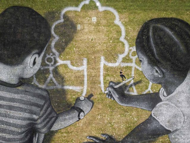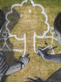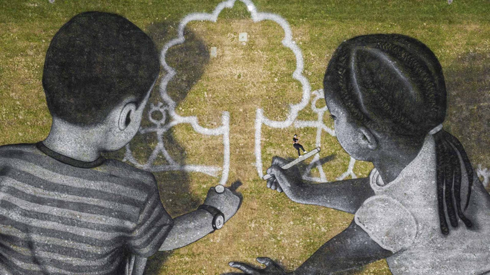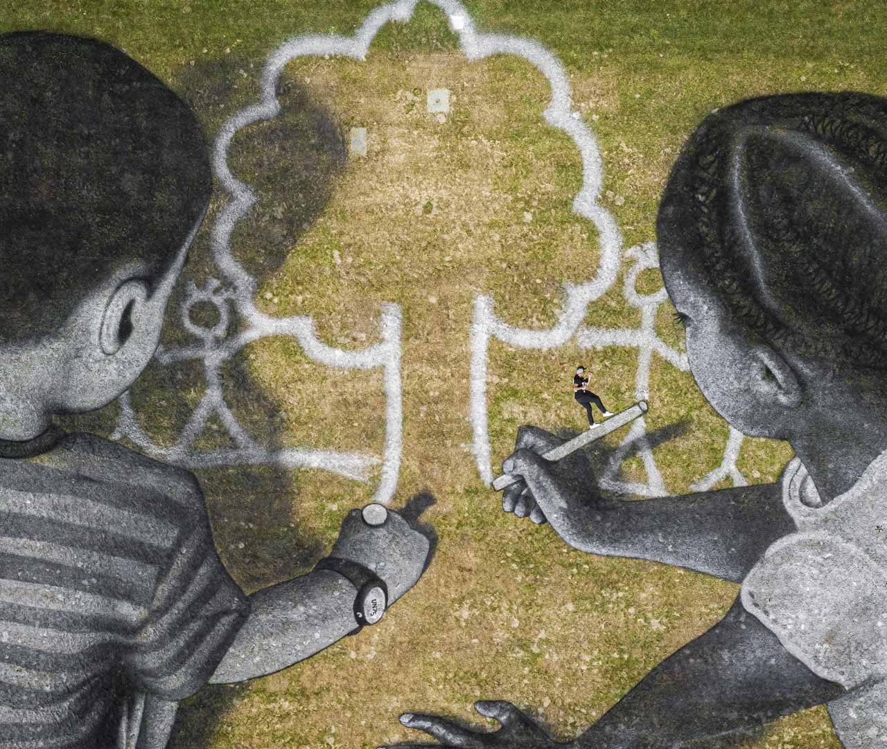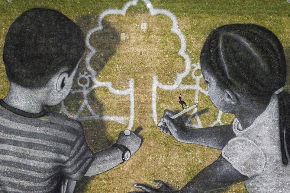Artist Saype poses with his land art painting at UN Headquarters, Geneva, Switzerland