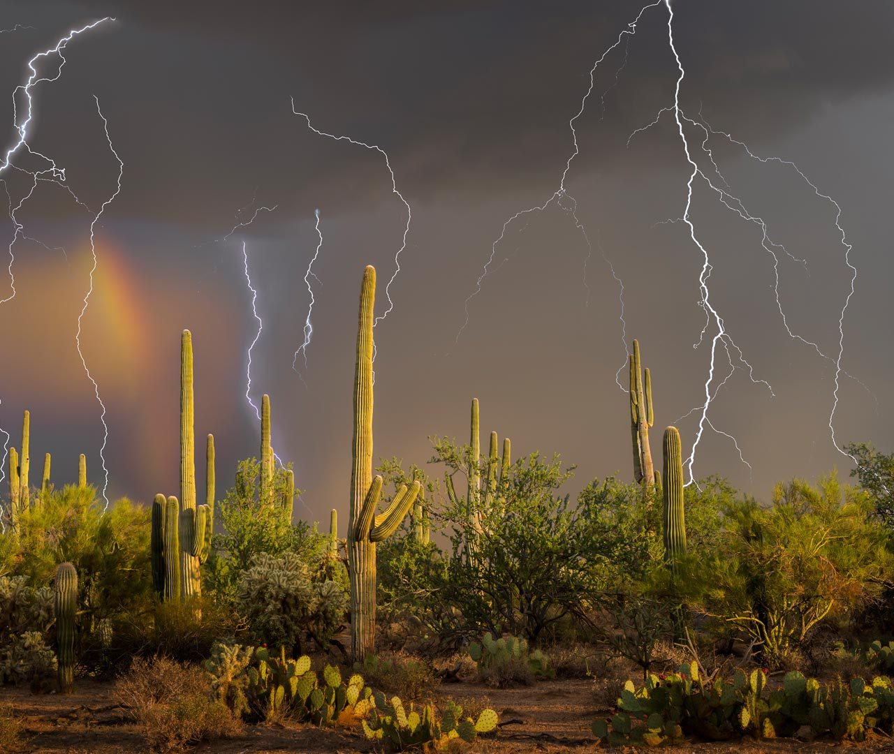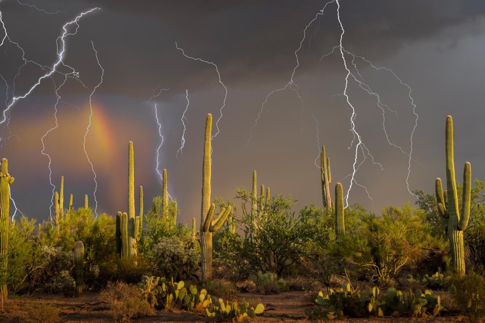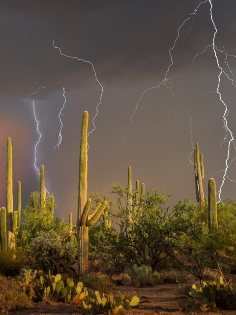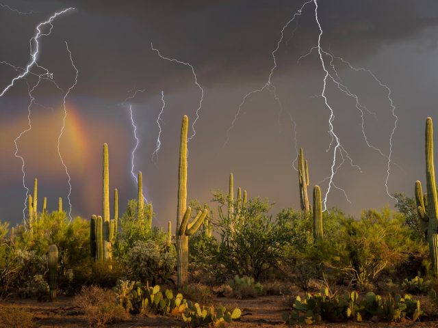 Lightning storm over saguaro cacti, Sonoran Desert, Arizona, United States