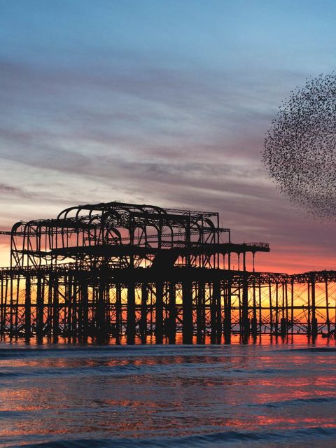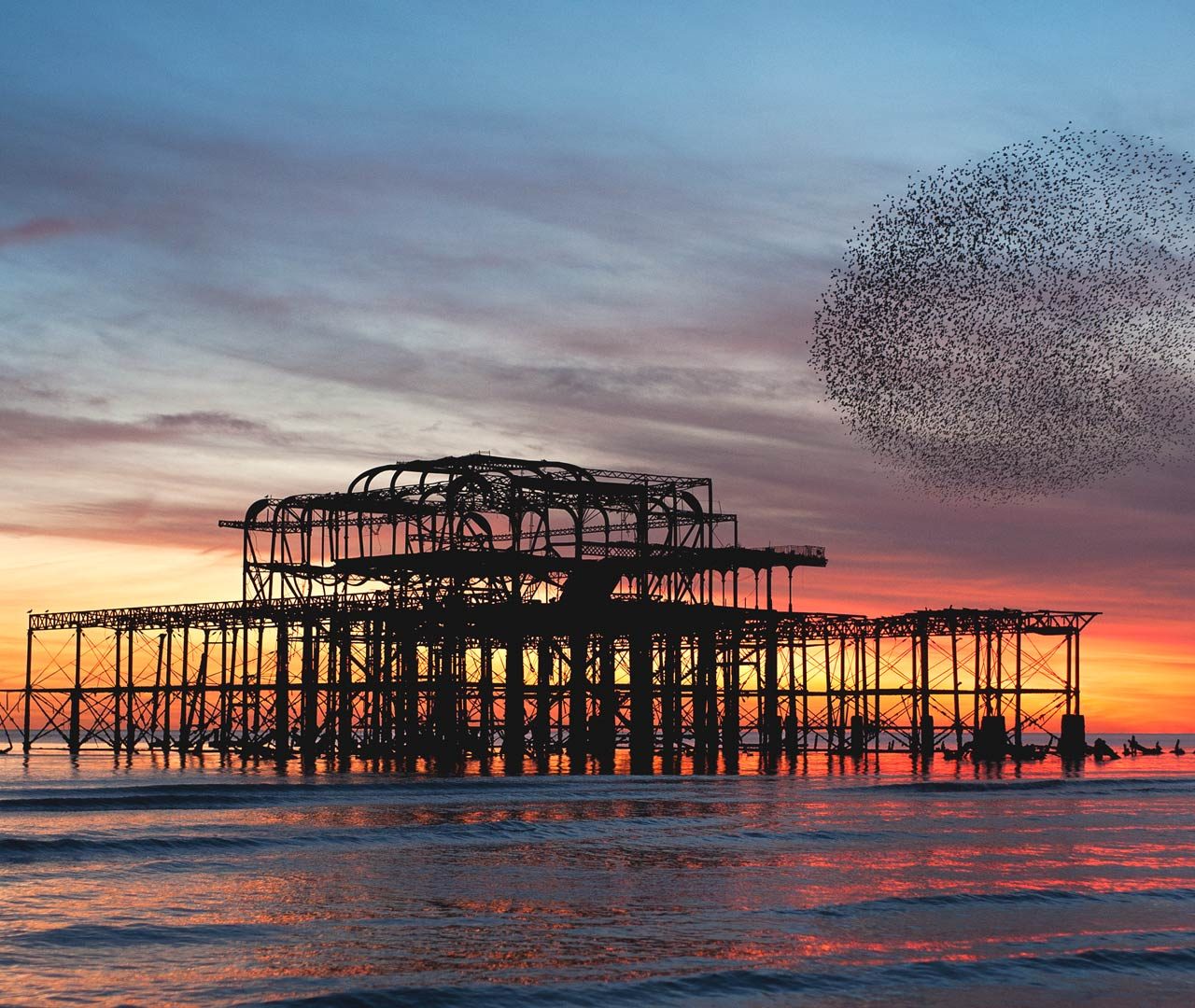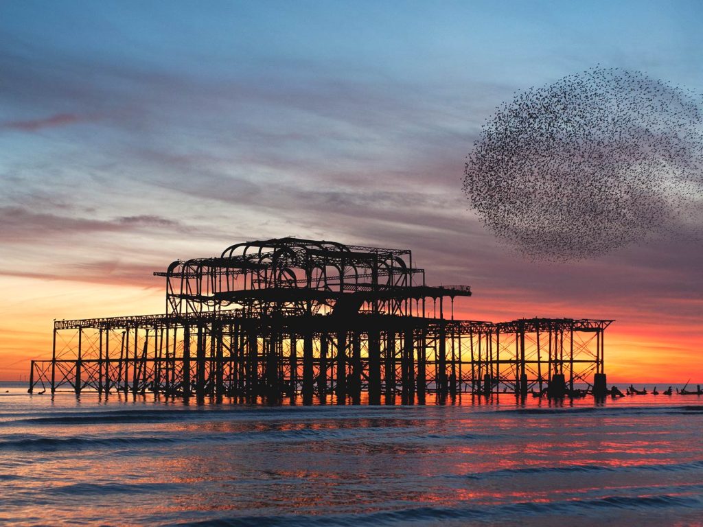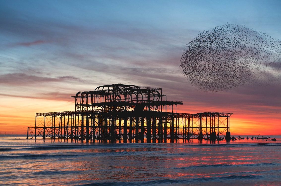 Starling murmuration over the ruins of Brighton's West Pier, England