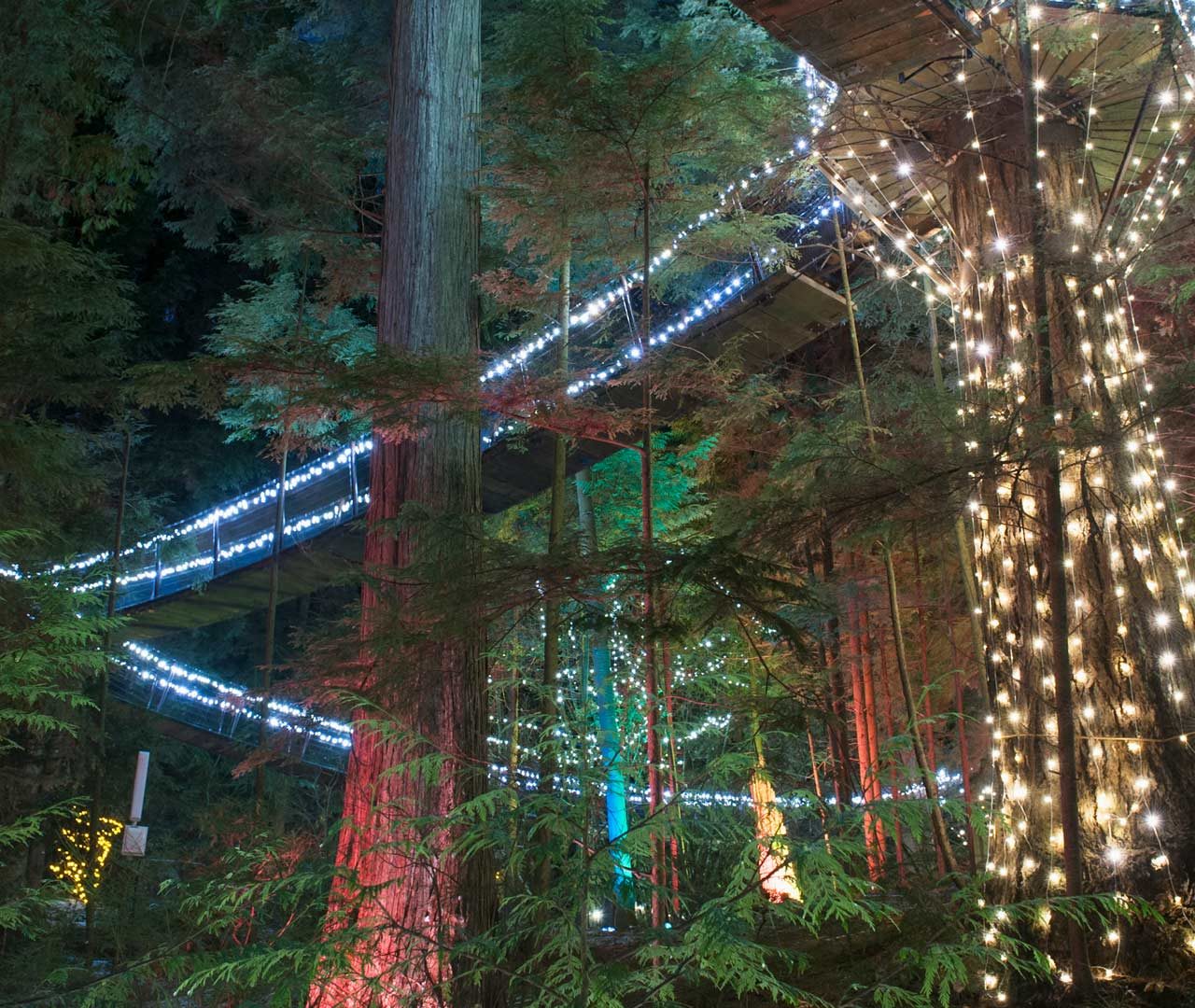 Le pont suspsendu de Capilano et son parc illuminés, Vancouver, Colombie-Britannique